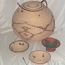 BALAIO (45X57 CM, APROXIMADOS), EM PALHA, COM DESENHOS GEOMÉTRICOS EM MARROM. POSSUI DUAS ALÇAS SUPERIORES E TAMPA. ACOMPANHA DUAS CESTAS (26X5 CM E 25X5,5 CM), EM MESMO MATERIAL, COM DETALHES EM PALHA MARROM; E UMA FRUTEIRA (24X9,5 CM), COM PÉ, REVESTIDA COM FIO DE PLÁSTICO NAS CORES VERMELHO E VERDE, FORMANDO DESENHOS GEOMÉTRICOS. ACOMPANHA CARTÃO DO REMETENTE, 'HIS EXCELLENCY MR LUIZ INACIO LULA DA SILVA / PRESIDENT OF THE FEDERATIVE REPUBLIC OF BRAZIL' E 'WITH THE COMPLIMENTS OF SAM NUJOMA / PRESIDENT OF THE REPUBLIC OF NAMIBIA'.