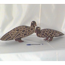 DUAS ESCULTURAS EM MADEIRA, EM FORMA DE PÁSSARO (39X18 CM E 41X16 CM). PINTADAS EM TONS DE MARROM E PRETO, COM RANHURAS NA PRÓPRIA MADEIRA, FORMANDO DESENHO DAS PENAS.
