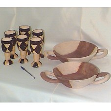 DUAS GAMELAS (25X6,5 CM E 21,5X6 CM), EM MADEIRA CLARA COM MANCHA ESCURA, POSSUINDO, CADA UMA, DUAS ALÇAS LATERAIS EM MESMO MATERIAL. SEIS COPOS (15 16 E 17 CM) EM MADEIRA, FORMATO DE TAÇA, EM COR AMARELADA, COM DESENHOS E ENTALHES GEOMÉTRICOS, PINTADOS EM MARROM ESCURO.