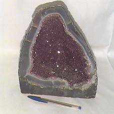 PEDRA DE CRISTAL (9X21X26,5 CM). EXTERIOR EM FORMA BRUTA; CORTE LAPIDADO E INTERIOR OCO, COM CRISTAIS NA COR LILÁS.