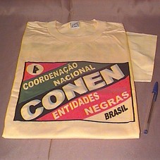 CAMISETA (TAM GG), EM MALHA AMARELA, DE MANGA CURTA. NA FRENTE, ESTAMPA EM VERMELHO, VERDE, PRETO, 'COORDENAÇÃO NACIONAL / CONEN / ENTIDADES NEGRAS / BRASIL'. E, ATRÁS, 'MILTON SANTOS / 'O FATO DE EU SER NEGRO E A EXCLUSÃO CORRESPONDENTE ACABAM POR ME CONDUZIR À CONDIÇÃO DE PERMANENTE VIGILIA.''