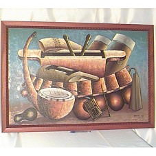 QUADRO COM PINTURA ACRÍLICA (103,5X68 CM) SOBRE TELA, RETRATANDO DIVERSOS INSTRUMENTOS MUSICAIS REGIONAIS. PREDOMINA TONS DE MARROM, COM FUNDO AZUL. NO CANTO INFERIOR DIREITO, ASSINATURA DO ARTISTA 'XALEMBA 002'. MOLDURA EM MADEIRA (113,5X78 CM) EM TOM AVERMELHADO.