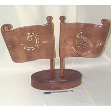 ESCULTURA (51X33 CM) EM MADEIRA. DUAS BANDEIRAS, UMA DO BRASIL, OUTRA DA ANGOLA, AMBAS COM HASTE FIXADA EM BASE OVAL (27,5X17,5X4 CM), DE MESMO MATERIAL, TENDO NA PARTE FRONTAL, PLACA (9,5X3 CM) EM METAL, NA COR AMARRONZADA COM INSCRIÇÃO PRATEADA: 'ANGOLA-BRASIL / COMPREENDIDOS ONTEM / JUNTOS HOJE / FRATERNOS PARA SEMPRE / HOMENAGEM A VISITA DE SUA EXIA PRESIDENTE LULA DA SILVA AO C.F.P. DO CAZENGA / LUANDA/NOV/03'. NO VERSO DA BASE, 'ARTESÃO LEMOS'. OBS.: A HASTE DA BANDEIRA DA ANGOLA ESTÁ DESCOLANDO.