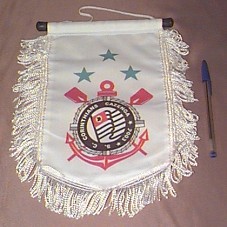 FLÂMULA (16,5X26,5 CM) EM TECIDO BRANCO, FIXADA EM BASTÃO DE MADEIRA COM PONTEIRAS EM BORRACHA PRETA. NA FRENTE, EMBLEMA DO TIME 'S. C. CORINTHIANS CAZENGA / 2003' E TRÊS ESTRELAS EM AZUL. POSSUI ARREMATE EM FRANJA BRANCA.