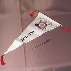 FLÂMULA TRIANGULAR (22X47 CM) EM TECIDO BRANCO, TENDO NA PONTA FRANJA VERMELHA COM ARREMATE EM METAL. FIXADA EM BASTÃO DE MADEIRA, COM PONTEIRAS EM MESMO MATERIAL, E CORDÃO VERMELHO COM MESMA FRANJA. NA FRENTE, O EMBLEMA DO 'CORINTHIANS DO CAZENGA' E '2003'.