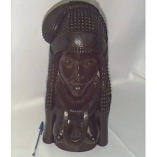 ESCULTURA (38 CM) EM ÉBANO. BUSTO DE UMA MULHER AFRICANA, COM OS SEIOS EXPOSTOS, COLAR, FAIXA NA CABEÇA, E CABELO RASTAFARI. ACOMPANHA ENVELOPE COM CARTÃO DO REMETENTE: 'À S.E. LUIZ INÁCIO LULA DA SILVA / PRESIDENTE DA REPÚBLICA FEDERATIVA DO BRASIL / LUANDA / COM OS MELHORES CUMPRIMENTOS DE JOSÉ EDUARDO DOS SANTOS / PRESIDENTE DA REPÚBLICA DE ANGOLA'. OBS.: ENCONTRA-SE COM UMA PEQUENA RACHADURA NO LADO DIREITO DA CABEÇA.