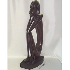 ESCULTURA (67 CM) EM ÉBANO. FIGURA DE UM MENINO SENTADO, COM AS PERNAS DOBRADAS APOIANDO OS COTOVELOS, E MÃOS NA CABEÇA. FIXADA EM BASE (36X18X4,5 CM) DE MESMO MATERIAL, DE FORMATO OCTOGONAL, ENTALHADA NAS LATERAIS E NO TOPO, FORMANDO DESENHOS GEOMÉTRICOS. NO FUNDO DA BASE, INSCRIÇÃO 'JONAS / LUANDA 2003'. ACONDICIONADO EM CAIXA VERMELHA (26X45X77 CM), COM TAMPA FRONTAL, POSSUINDO INSCRIÇÕES EM DOURADO NA MESMA: 'REPÚBLICA DE ANGOLA / PRESIDÊNCIA DA REPÚBLICA'.