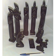 PRESÉPIO, EM ÉBANO, COMPOSTO POR: MARIA (AJOELHADA E REZANDO) (11 CM); JOSÉ (AJOELHADO, SEGURANDO UMA CABRA) (13 CM); MANJEDOURA (8,5X3X2,5 CM); MENINO JESUS (6,5 CM); DUAS CABRAS (6,5 E 5,5 CM); QUATRO REIS MAGOS (25 CM) MAIS UM MEMBRO (25 CM). TODOS ACONDICIONADOS EM CAIXA DE MADEIRA (34,5X24X9,5 CM), COM ENTALHE NAS LATERAIS E, GRAVADO NA TAMPA, DESENHO DE UMA GIRAFA COMENDO FOLHAS.