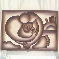 PINTURA EM TELA (104,5X74 CM), FIGURA DE UM CASAL SEGURANDO UM BEBÊ. FIGURA ESTEREOTIPADA, DE FORMAS ARREDONDADAS, EM TONS DE MARROM, COM TEXTURA AREOSA. NO CANTO INFERIOR ESQUERDO, 'NTIMAIO 03' (OU 'NTI MAIO 03'). TELA CHEGOU ENROLADA E ACONDICIONADA EM TUBO VERMELHO, COM INSCRIÇÃO 'REPÚBLICA DE ANGOLA / PRESIDÊNCIA DA REPÚBLICA', EM DOURADO.