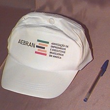 BONÉ EM TECIDO BRANCO, COM ESTAMPA NA FRENTE 'AEBRAN / ASSOCIAÇÃO DE EMPRESÁRIOS E EXECUTIVOS BRASILEIROS EM ANGOLA', E SÍMBOLO DA ASSOCIAÇÃO.