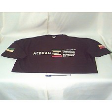 CAMISETA (TAM G) EM MALHA PRETA, DE MANGA CURTA. NA FRENTE, ESTAMPA COM A INSCRIÇÃO 'AEBRAN / ASSOCIAÇÃO DE EMPRESÁRIOS E EXECUTIVOS BRASILEIROS EM ANGOLA', E RESPECTIVO SÍMBOLO. ATRÁS, SÍMBOLO COM SIGLA; E, NAS MANGAS, SÍMBOLO.