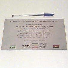 PLACA (20,8X15 CM) EM METAL PRATEADO, COM A INSCRIÇÃO GRAVADA EM PRETO 'A ASSOCIAÇÃO DE EMPRESÁRIOS BRASILEIROS EM ANGOLA PRESTA HOMENAGEM AO EXMO. SR. LUIZ INÁCIO LULA DA SILVA / PRESIDENTE DA REPÚBLICA FEDERATIVA DO BRASIL / PRESIDENTE DE HONRA DA AEBRAN / PELA SUA DETERMINAÇÃO EM ESTIMULAR AS RELAÇÕES ENTRE BRASIL E ÁFRICA, INCENTIVANDO DE MODO SIGNIFICATIVO O INTERCÂMBIO ENTRE BRASIL E ANGOLA. LUANDA, NOVEMBRO DE 2003'. NA PARTE INFERIOR, BANDEIRAS DO BRASIL E DA ANGOLA, E SÍMBOLO DA AEBRAN. VERSO DA PLACA EM VELUDO AZUL MARINHO. ACONDICIONADA EM CAIXA (23X18X3 CM) FORRADA DE LYCRA PRETA.