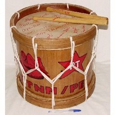 TAMBOR (36X40CM) CONFECCIONADO EM MADEIRA E PELE DE ANIMAL, TRAZENDO DESENHADOS EM SEU BOJO A ESTRELA DO PT, UM HOMEM ENCOLHIDO SÍMBOLO DO MOVIMENTO TORTURA NUNCA MAIS E A INSCRIÇÃO 'MTNM/PE'. NA PELE SUPERIOR ESTÃO GRAFADAS ALGUMAS ASSINATURAS E A INSCRIÇÃO 'MOVIMENTO TORTURA NUNCA MAIS, AGRADECE A ATENÇÃO E O CARINHO. DE TODOS NÓS PERNAMBUCANO.' ACOMPANHAM DUAS BAQUETAS DE MADEIRA.