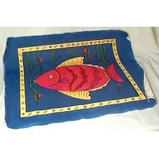 TELA (73X59CM) RETRATANDO UM PEIXE VERMELHO NUM FUNDO AZUL E DENTRO DE UM QUADRANTE AMARELO.