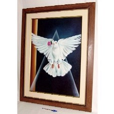 QUADRO (91X71CM) RETRATANDO UMA POMBA BRANCA COM UMA ROSA NO BICO. MOLDURA EM MADEIRA MARROM E PASSE-PARTOUT BEGE COM FRISOS DOURADOS.