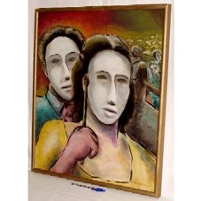 QUADRO (67X56CM) RETRATANDO UMA MULHER, NA FRENTE, E UM HOMEM, ATRÁS, CADA QUAL COM UMA MÁSCARA BRANCA NO ROSTO, TENDO NO FUNDO OUTROS CASAIS QUE PARECEM ESTAR DANÇANDO. PREDOMINAM OS TONS DE AMARELO, AZUL E VERMELHO. MOLDURA EM MADEIRA DOURADA.