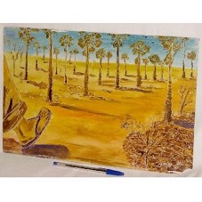ÓLEO SOBRE MADEIRA (26X40CM) RETRATANDO UMA PAISAGEM COM BURITIS E PARTE DE UMA PERNA HUMANA, CALÇADA COM SANDÁLIAS, NO CANTO ESQUERDO DA OBRA.