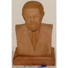 ESCULTURA (44X28,5X18CM) EM MADEIRA CLARA RETRATANDO O BUSTO DO PRESIDENTE LULA. NA PARTE DE TRÁS, UMA PORTA QUE SE ABRE A PARTIR DE UMA COMBINAÇÃO DE TRÊS PINOS, DANDO ACESSO A UM PEQUENO ARMÁRIO COM UMA PRATELEIRA.