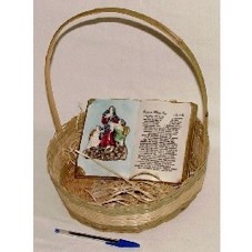 BÍBLIA (15X20CM) EM GESSO QUE TRAZ GRAVADA A ORAÇÃO À MARIA DESATADORA DOS NÓS E, EM ALTO RELEVO, A IMAGEM DA SANTA. ACONDICIONADA EM CESTA (36X29CM) DE VIME COM ALÇA EM ARCO.