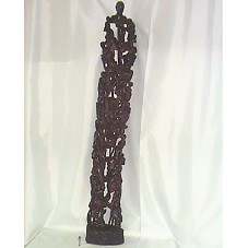 ESCULTURA EM ÉBANO (139 CM). COMPOSIÇÃO DE VÁRIAS FIGURAS HUMANAS SOBREPOSTAS, FORMANDO UMA TORRE. NO TOPO, UM BUSTO MASCULINO SE SOBRESSAI. HÁ PESSOAS DE DIVERSAS FORMAS: DEITADA; EM PÉ; TOCANDO ALGUM INSTRUMENTO; CARREGANDO CÂNTAROS; CRIANÇAS, ADULTOS E IDOSOS; ETC. OBS.: A ESCULTURA NÃO FICA EM PÉ SEM ESTAR APOIADA. A BASE ENCONTRA-SE RACHADA.