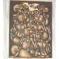 PINTURA (113X151,5 CM) A ÓLEO SOBRE TELA. IMAGEM DE VÁRIAS PESSOAS E CRIANÇAS AMONTOADAS, TODAS COM AS MÃOS NA CABEÇA, OS OLHOS FECHADOS E A BOCA ABERTA. NA PARTE SUPERIOR CENTRAL, UMA POMBA. PREDOMINA OS TONS DE MARROM, COM ALGUMAS NUANCES EM VIOLETA, AZUL E VERDE. NO CANTO INFERIOR DIREITO, A ASSINATURA 'MANKEU 91'. MOLDURA EM MADEIRA (117X155 CM).
