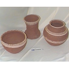 TRÊS VASOS CERÂMICOS, COR TERRA, COM PINTURAS DO PRÓPRIO MATERIAL ESBRANQUIÇADO, DE DIFERENTES FORMATOS E TAMANHOS. O PRIMEIRO (28X22,5 CM), EM FORMA DE CONE; O SEGUNDO (20X33 CM), COM BORDA EXTERNA DENTADA; E O TERCEIRO (30X19X32 CM), COM CENTRO ABAULADO E BOCA MAIS ESTREITA.
