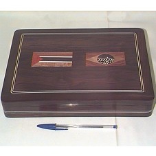 CAIXA (28,7X21,5X5 CM) EM MADEIRA ESCURA, COM AS BANDEIRAS DO BRASIL E DE MOÇAMBIQUE MARCHETADAS NA TAMPA. POSSUI FRISO BRANCO NAS LATERAIS E NA TAMPA. ACOMPANHA CARTÃO DO REMETENTE 'À SUA EXCELÊNCIA O SENHOR PRESIDENTE LUIZ INÁCIO LULA DA SILVA / E. M. / COM OS CUMPRIMENTOS RESPEITOSOS, UMA LEMBRANÇA DE MOÇAMBIQUE / VERÔNICA E PEDRO CARNEIRO DE MENDONÇA / MAPUTO, NOVEMBRO DE 2003'.