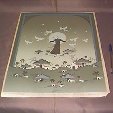 PINTURA (35X45 CM) EM SERIGRAFIA. IMAGEM DE SÃO FRANCISCO DE ASSIS, DIANTE DE UM VILAREJO, COM POMBAS E ANJOS AO SEU REDOR. PREDOMINA OS TONS DE MARROM E VERDE, COM DETALHES EM BRANCO, AZUL E PRETO. NA PARTE INFERIOR, A INSCRIÇÃO 'P.A. / 12/15 'IRMÃO SOL' / PARA LEÔNIA, MEU ABRAÇO FRANCISCANO, DO SEU AMIGO, NELSON PROTO '83'. ATRÁS, 'SERIGRAFIA DE NELSON PORTO - RIO DE JANEIRO'. ENCONTRA-SE ENVELHECIDO E COM ALGUMAS MANCHAS.
