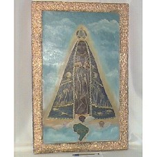 PINTURA (43X73,5 CM) DA IMAGEM DE NOSSA SENHORA APARECIDA, NAS NUVENS, COM TRÊS ANJOS SOB SEUS PÉS, E O MAPA DO BRASIL LOGO ABAIXO. PREDOMINA OS TONS DE AZUL, MARROM E AMARELO. DENTRO DA FIGURA DO MAPA DO BRASIL, A INSCRIÇÃO 'LEÔNIA 02'. POSSUI MOLDURA (53X81 CM) TEXTURIZADA EM PÁTINA DOURADA, COM DESENHOS DE ARABESCOS, DO ARTISTA VALDIVINO BROTAS. ATRÁS, INFORMAÇÕES 'TÍTULO: NOSSA SENHORA APARECIDA DE CACHOEIRA DOURADA-MG / 81X53 / ÓLEO SOBRE TELA / LEÔNIA DE VASCONCELOS / MOLDURA EM PÁTINA DE VALDIVINO BROTAS'.