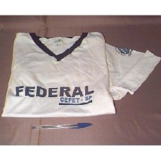 CAMISETA (TAM GG), EM MALHA BRANCA, DE MANGA CURTA, COM GOLA AZUL MARINHO CANELADA, EM 'V'. NA FRENTE, EM TONS DE AZUL, 'FEDERAL / CEFET - SP'. NA MANGA ESQUERDA, 'CENTRO FEDERAL DE EDUCAÇÃO TECNOLÓGICA DE SÃO PAULO / CEFET-SP' E RESPECTIVO SÍMBOLO.