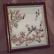QUADRO, COM ESTAMPA BORDADA (35X35 CM), DESENHO DE DOIS PÁSSAROS AZUIS EM UM GALHO DE ÁRVORE, COM DIVERSAS FLORES AO REDOR. PREDOMINA OS TONS DE ROSA, BRANCO, MARROM E AZUL. NO CANTO SUPERIOR DIREITO, IDEOGRAMAS JAPONESES EM PRETO E VERMELHO. PASSE-PARTOUT EM TECIDO ESVERDEADO; E, MOLDURA EM MOGNO (43X43 CM), COM TAMPO DE VIDRO. NA PARTE SUPERIOR DA MOLDURA, EM METAL DOURADO TRABALHADO, DOIS SUPORTES PARA SUSTENTAÇÃO EM PAREDE. ACONDICIONADO EM CAIXA DE PAPELÃO (47X48,5X5,5 CM), COM TAMPA COM MOTIVOS VERDES.