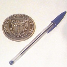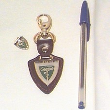 BÓTON (1,5 CM), FORMATO DE BRASÃO, COM SÍMBOLO DA 'UNIVERSIDADE PAULISTA DE MEDICINA', UMA COBRA ENROSCADA NUMA ÁRVORE; E, CHAVEIRO, COM MESMA INSÍGNIA FIXADA EM COURO.