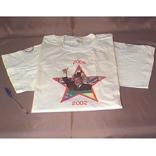 QUATRO CAMISETAS (TAM GG), EM MALHA BRANCA, DE MANGA CURTA. NA FRENTE, ESTAMPA DE UMA ESTRELA COM FOTO DO PRESIDENTE LULA DENTRO DELA, TENDO ALGUMAS FOTOS DE BRASÍLIA E AS CORES DA BANDEIRA NACIONAL AO FUNDO; E, AINDA, A INSCRIÇÃO '2002 / 2006'. NAS MANGAS, SÍMBOLO DA 'ASSOCIAÇÃO AUTÔNOMA DOS FORNECEDORES DE CARNES BOVINAS E SUÍNAS DO ESTADO DE ALAGOAS' E A INSCRIÇÃO 'PARABÉNS PRESIDENTE LULA!'. ATRÁS, AS MESMAS ESTAMPAS CITADAS ANTERIORMENTE.