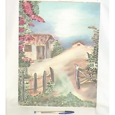 QUADRO COM PINTURA (30X40) SOBRE TELA, SEM MOLDURA. DESENHO DE UMA CASA NO CAMPO, TENDO, EM PRIMEIRO PLANO, UMA CERCA COM PORTEIRA E VEGETAÇÕES. ATRÁS, A INSCRIÇÃO 'COM CARINHO P/ O SR. / 20-11-2003 / AURIDE ROFRED / SC XXI', E, AINDA, ENDEREÇO DO REMETENTE.