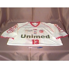 CAMISA DE FUTEBOL (TAM GG) DO 'CRB - CLUBE DE REGATAS BRASIL', EM POLIÉSTER, NA COR BRANCA, COM DETALHES E COSTURAS EM VERMELHO. NO CANTO SUPERIOR ESQUERDO, BRASÃO DO TIME; NA FRENTE, SÍMBOLOS DOS PATROCINADORES: 'SUEVIT / GALLO / SEEL AL ESPORTES / UNIMED' E O Nº '13'. ATRÁS, 'MACEIÓ / APAIXONANTE / 13 / GALLO'. NAS MANGAS, EM VERMELHO, 'CRYSTAL NORDESTE / FONTE STA. MARIA'. POSSUI SELO 'GALLO PRODUTO OFICIAL'.