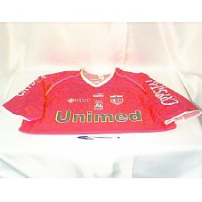 CAMISA DE FUTEBOL (TAM GG) DO 'CRB - CLUBE DE REGATAS BRASIL', EM POLIÉSTER, NA COR VERMELHA, COM DETALHES E COSTURAS EM BRANCO. NO CANTO SUPERIOR ESQUERDO, BRASÃO DO TIME; NA FRENTE, SÍMBOLOS DOS PATROCINADORES: 'SUEVIT / GALLO / SEEL AL ESPORTES / UNIMED'. ATRÁS, 'MACEIÓ / APAIXONANTE / 10 / GALLO'. NAS MANGAS, EM BRANCO, 'CRYSTAL NORDESTE / FONTE STA. MARIA'. POSSUI SELO 'GALLO PRODUTO OFICIAL'.