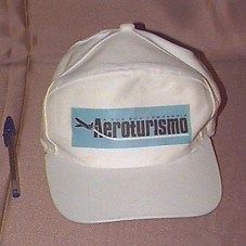 BONÉ EM BRIM BRANCO. NA FRENTE, ESTAMPA EM AZUL COM A INSCRIÇÃO 'AEROTURISMO / A SUA BOA COMPANHIA' E DESENHO DE UM AVIÃO DECOLANDO.