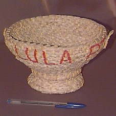 CESTA(20X12 CM) EM PALHA, FORMATO DE FRUTEIRA, COM DUAS ALÇAS LATERAIS. EM UMA DAS FACES, PINTADO EM VERMELHO, 'LULA PT'. ACOMPANHA PAPEL COM A INSCRIÇÃO 'SALVADOR ARCANJO DAS FLORES / ARTESANATO / ACAMPAMENTO DANDARA II / BR 153 - PROMISSÃO / MARIA BERNARDINA (IBOTIRANA BAHIA) 6983022 / ANIVERSÁRIO 26 NOV'.