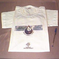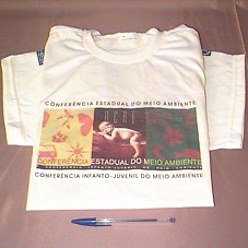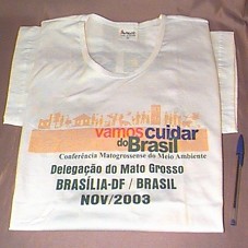 CAMISETA (TAM G), EM MALHA BRANCA, DE MANGA CURTA. NA FRENTE ESTAMPA EM VERDE, AMARELO, AZUL E VERMELHO; DESENHO DE CASAS E PESSOAS, E INSCRIÇÃO 'VAMOS CUIDAR DO BRASIL / CONFERÊNCIA MATOGROSSENSE DO MEIO AMBIENTE / DELEGAÇÃO DO MATO GROSSO / BRASÍLIA-DF / BRASIL / NOV/2003'. ATRÁS, SÍMBOLOS DE ALGUMAS INSTITUIÇÕES.