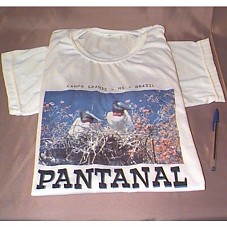 CAMISETA (TAM G), EM MALHA FRIA, NA COR BRANCA, DE MANGA CURTA. NA FRENTE, EM PRETO, 'CAMPO GRANDE - MS - BRASIL / PANTANAL'; E ESTAMPA COM FOTO DE DUAS GARÇAS EM UM NINHO, CERCADO POR GALHOS DE ÁRVORE.