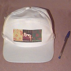 BONÉ EM BRIM BRANCO. NA FRENTE, ESTAMPA COM FOTO DE UM BEBÊ DEITADO NUM TRONCO DE ÁRVORE, ENTRE ESTAMPAS EM VERDE E AMARELO, E A INSCRIÇÃO 'ACRE / CONFERÊNCIA ESTADUAL DO MEIO AMBIENTE E CONFERÊNCIA INFANTO-JUVENIL DO MEIO AMBIENTE'.