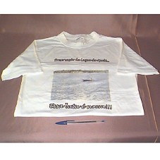 CAMISETA (TAM P), EM MALHA BRANCA, DE MANGA CURTA. NA FRENTE, EM PRETO, 'PRESERVAÇÃO DA LAGOA DO APODÍ... / ESSA LUTA É NOSSA!!!'; E ESTAMPA COM FOTO DA LAGOA.