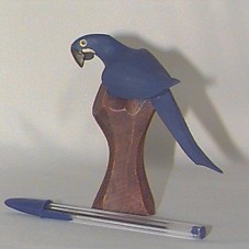 ESCULTURA EM MADEIRA E DUREPÓXI (11 CM). IMAGEM DE UMA ARARA AZUL EM CIMA DE UM TRONCO DE ÁRVORE.