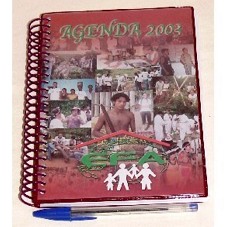 AGENDA ESCOLA FAMÍLIA AGRÍCOLA 2003 (21,5X17CM), TRAZENDO NA CAPA, ONDE PREDOMINAM TONS DE VERMELHO, FOTOGRAFIAS, A LOGOMARCA DA EFA E A INSCRIÇÃO 'AGENDA 2003'.