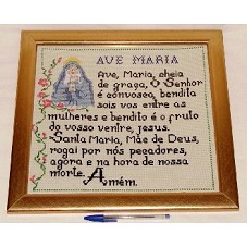QUADRO (39X40CM) TRAZENDO BORDADOS EM PONTO DE CRUZ A IMAGEM DE MARIA E A ORAÇÃO 'AVE MARIA'. MOLDURA EM MADEIRA DOURADA E PROTEÇÃO DE VIDRO.