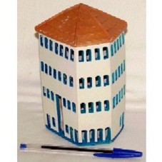 MINIATURA (17X7X9CM) DE UM SOBRADO CONFECCIONADA EM ARGILA, SENDO OS TELHADOS MARRONS, AS PAREDES BRANCAS E AS JANELAS AZUIS.