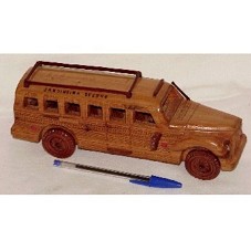 MINIATURA (9,5X25,5X5,5CM) EM MADEIRA CLARA DE UMA JARDINEIRA (NOME DADO, EM MINAS GERAIS, A UM TIPO DE ÔNIBUS MUITO COMUM NO BRASIL DE MEADOS DO SÉCULO XX), TRAZENDO AS INSCRIÇÕES 'JARDINEIRA DE 1949 / LEMBRANÇA DE TAQUARAL MG', EM CIMA, E '49 / JUAREZ E LOURDES / TAQUARAL MG / ITINGA MG'.