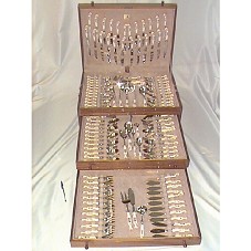 FAQUEIRO EM INOX, COM CABO EM OSSO E CHIFRE DE BÚFALO, NA COR MARFIM, IMITANDO PÁSSARO. COMPOSTO POR 114 PEÇAS, ENTRE TALHERES DE SOBREMESA, PARA PEIXE, CONCHAS, ETC. ACONDICIONADO EM ESTOJO DE MADEIRA MARCHETADA (48,5X66,5X27,5 CM), COM DUAS GAVETAS NA PARTE FRONTAL, POSSUINDO CHAVE E ALÇAS LATERAIS, E INFORMATIVO SOBRE A PEÇA, TENDO NA TAMPA A INSCRIÇÃO 'GENERAL EMILE LAHOUD LIBAN'. ACOMPANHA CARTÃO DO REMETENTE 'S.E.M LUIZ INÁCIO LULA DA SILVA / LE GÉNÉRAL EMILE LAHOUD / PRÉSIDENT DE LA RÉPUBLIQUE LIBANAISE'.