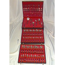 FAQUEIRO EM INOX, COM CABO EM OSSO E CHIFRE DE BÚFALO, NA COR PRETA, COM DETALHES DOURADOS, IMITANDO PÁSSARO. COMPOSTO POR 79 PEÇAS. ACONDICIONADO EM ESTOJO DE MADEIRA FORRADA COM NAPA PRETA (45,5X55,5X18,5 CM), TENDO DUAS GAVETAS COM PUXADORES DOURADOS NA PARTE FRONTAL, E ALÇAS LATERAIS.