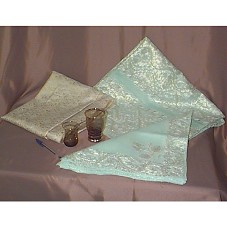 CONJUNTO DE DOZE COPOS GRANDES E DOZE PEQUENOS, NA COR ÂMBAR, COM DESENHO DE CACHO DE UVAS E RAMOS GRAVADO, E DETALHES EM PINTURA DOURADA. ACOMPANHA UMA TOALHA DE MESA COM DOZE GUARDANAPOS, EM TECIDO VERDE-ÁGUA TRANSPARENTE, COM BORDADO EM LINHAS BRANCA E DOURADA, FIGURAS DE FLORES E FOLHAS, ACONDICIONADA EM CAIXA DE MADEIRA (38,5X27,5X12 CM) COM TAMPA EM MOSAICO (DOURADO E TONS DE MARROM); E, TECIDO NA COR BEGE COM DESENHOS EM DOURADO E BRANCO (PÁSSAROS E FLORES), ACONDICIONADO EM ESTOJO DE MADEIRA COM TAMPA TRABALHADA COM DESENHOS VAZADOS. TUDO ACONDICIONADO EM CAIXA FORRADA DE CAMURÇA MARROM (60X46X26,5 CM), TENDO NA TAMPA UMA ÁGUIA GRAVADA. ACOMPANHA CARTÃO COM INSCRIÇÕES ÁRABES, EM ENVELOPE 'SUAS EXCELENCIAS SENHOR LUIZ INACIO LULA DA SILVA / PRESIDENTE DA REPUBLICA FEDERATIVA DO BRASIL / E SENHORA MARISA LETICIA LULA DA SILVA'.
